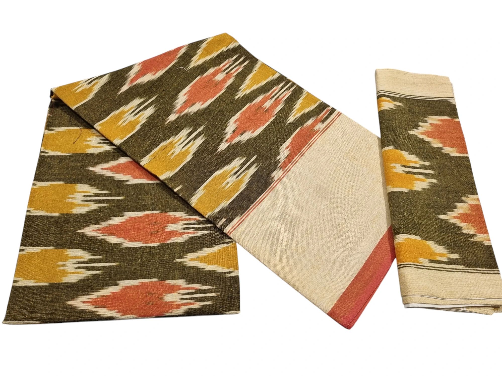 Experience the perfect blend of tradition and elegance with our Ikat Mercerised Cotton Saree with Matching Blouse. Crafted from premium