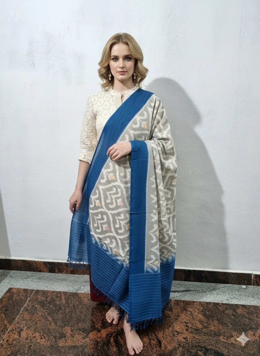 Elevate your ethnic style with this Pure Cotton Pochampally Dupatta, handwoven by skilled artisans using the traditional Ikat tie-dye technique. Crafted with lightweight, breathable cotton, this dupatta is perfect for daily wear or festive occasions. Its vibrant geometric patterns and soft texture make it a timeless addition to your wardrobe.