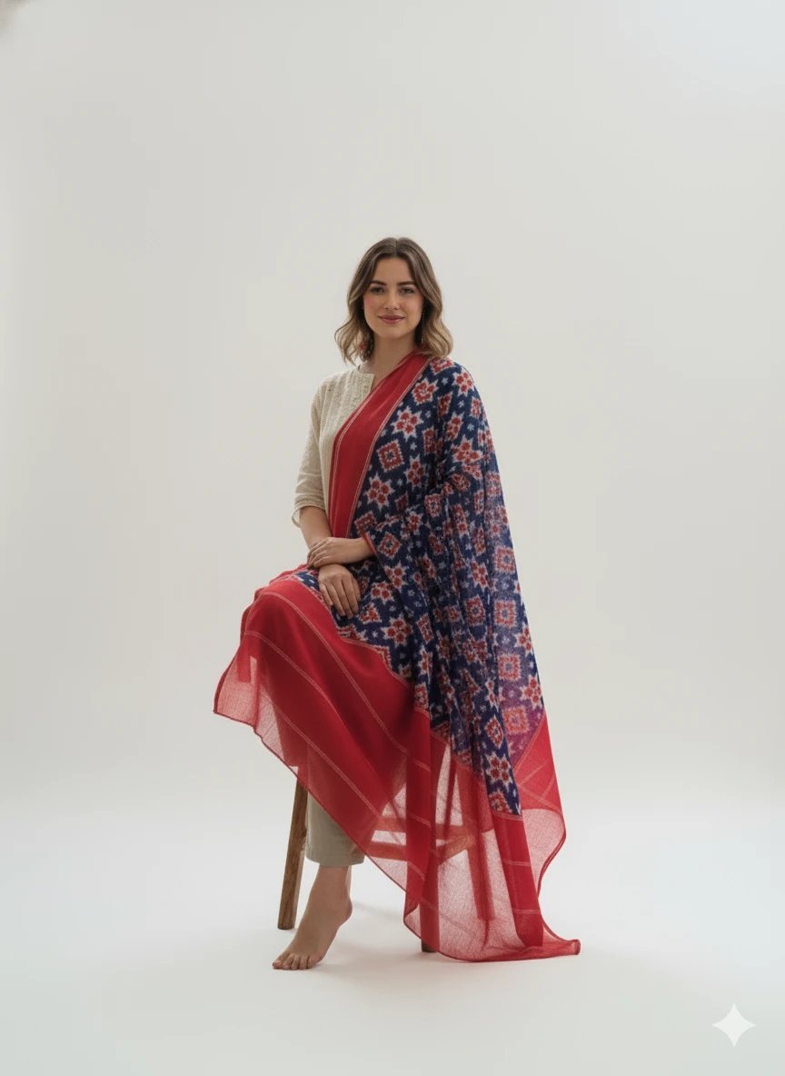 Shop authentic Telia Dupatta – 2.5 meters Double Ikat, crafted from pure cotton handloom by skilled weavers of Pochampally. Experience the elegance of traditional patterns with vibrant natural colors. Buy this exclusive Telia Dupatta at a low price compared to others, only at PAVANKUMARWEAVES.IN — your trusted source for original handloom products.