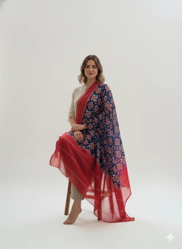 Pochampally Dupatta – Timeless Elegance in Mercerized Cotton Experience the Beauty of Handwoven Pochampally Dupatta Crafted with precision and dedication,